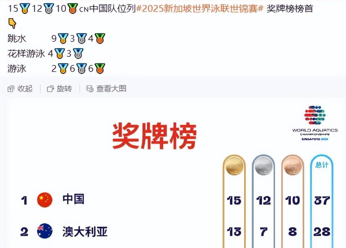 奖牌榜的辉煌数字掩不住冰冷事实:中国跳水队奥运项目金牌数从巴黎周期7金跌至6金,游泳队金牌数从多哈世锦赛7金缩水至2金。 澳大利亚13金、美国10金紧咬身后,墨西哥单届1金4银创历史。 领奖台上,对手的泪水与欢呼映照着中国队的沉默。